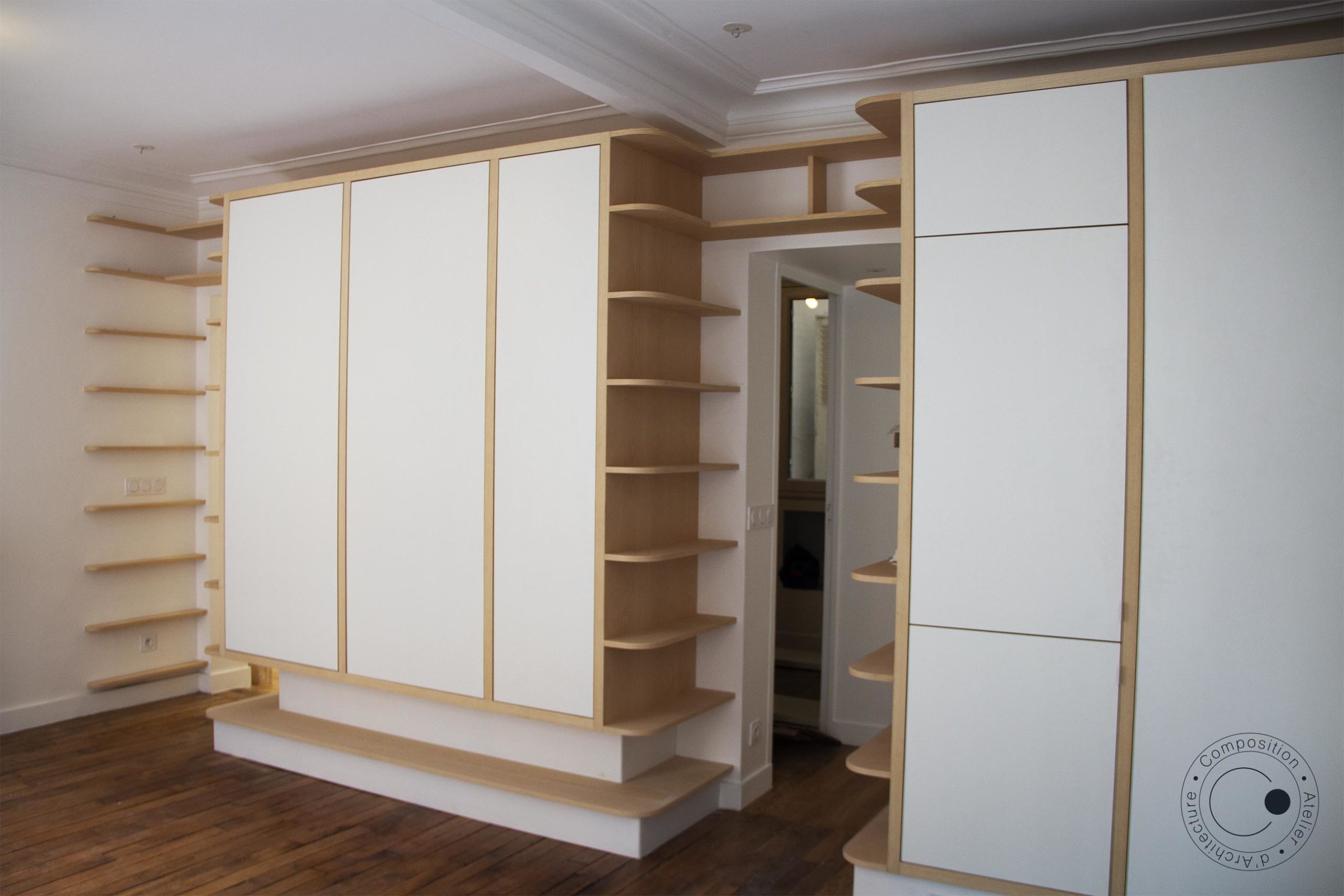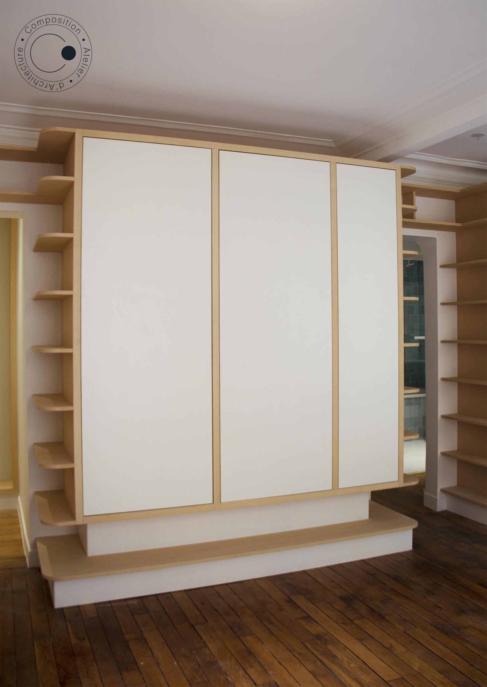 Le linéaire de bibliothèque structure le projet et donne une cohérence à l’ensemble. C’est ce rayonnage qui accompagne l’entrée dans l’appartement, hiérarchise les espaces entre la cuisine et le séjour. C’est aussi lui qui va permettre de créer une épaisseur d’isolation phonique et spatiale pour la chambre parentale.