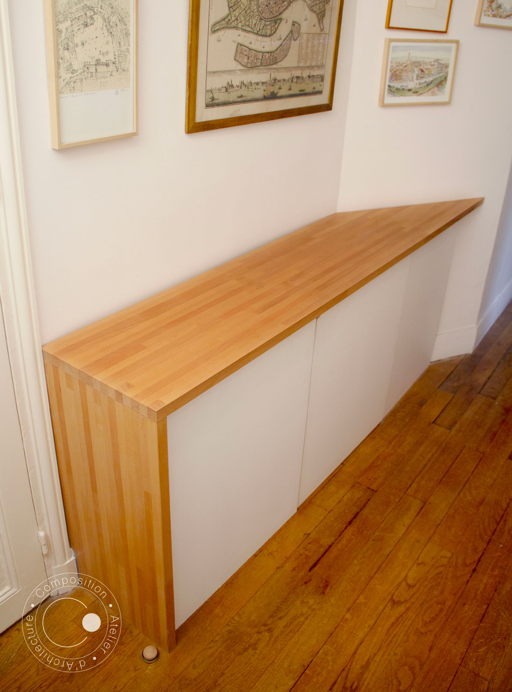 Le troisième et dernier meuble est un vide poche qui s’insère dans l’espace étroit de l’entrée de l’appartement.