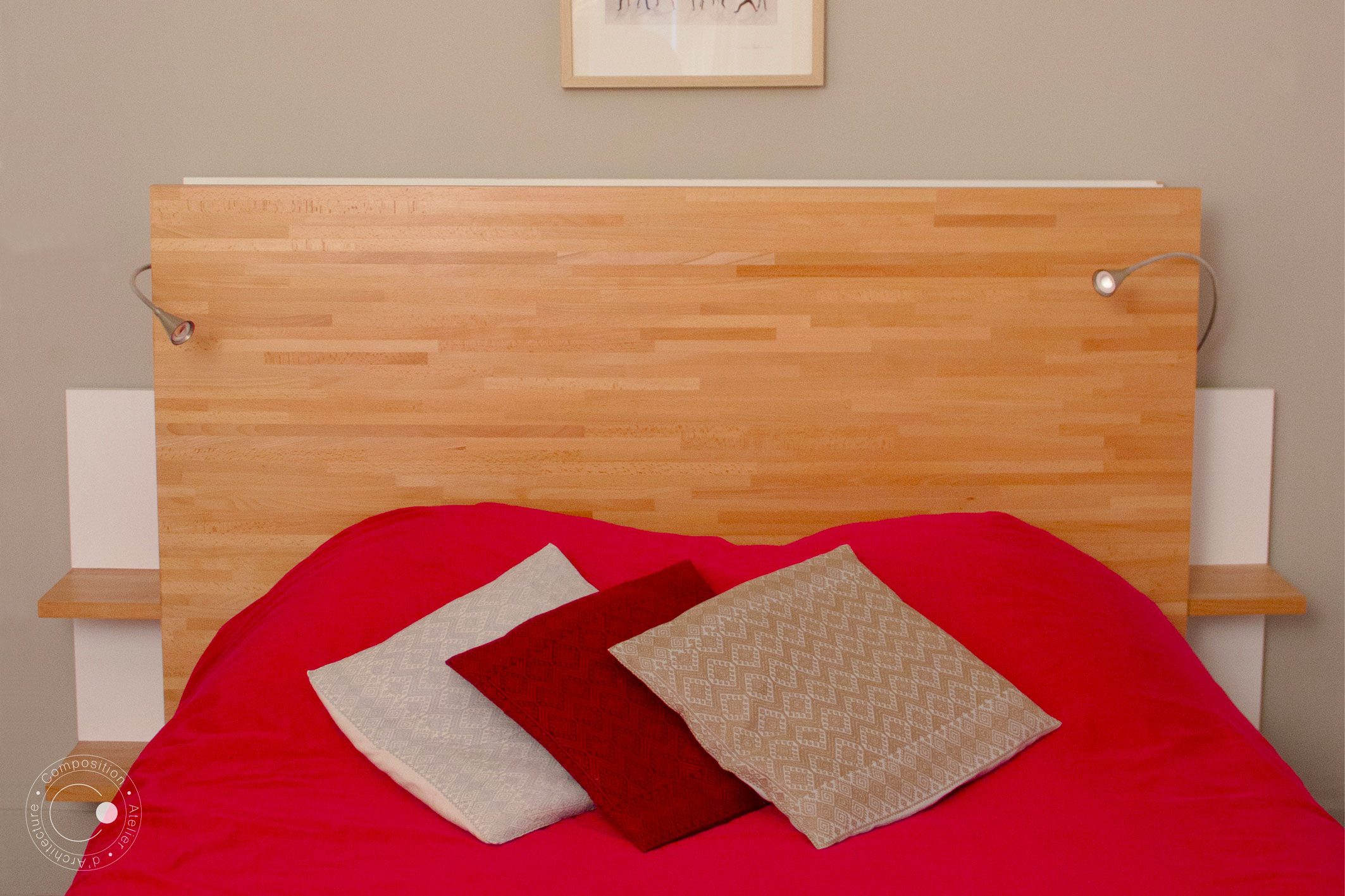 Le second meuble est une tête de lit. En plus de sa fonction principale, elle joue le rôle de rangement et de table de nuit.
