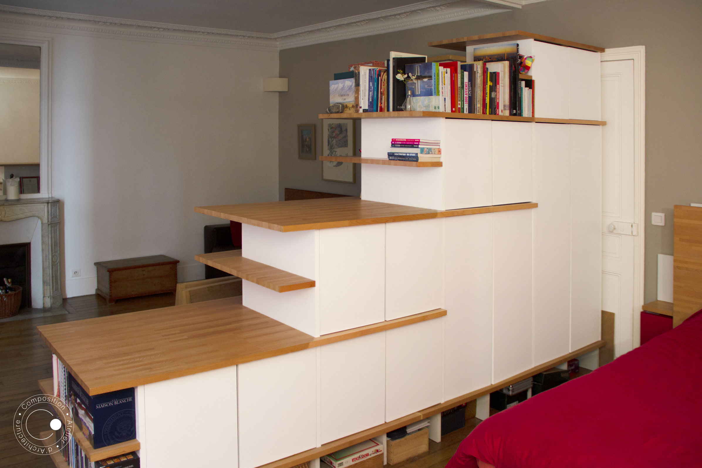 Le premier meuble, le plus volumineux, est une bibliothèque / penderie. Celle-ci permet de dissocier l’espace de jour de l’espace de nuit par la création d’une séparation. C’est un meuble cloison qui porte en lui deux fonctions : la penderie pour la partie privative et la bibliothèque pour la partie publique. Sa découpe en caisson laisse entrer la lumière dans l’appartement tout en masquant le lit.